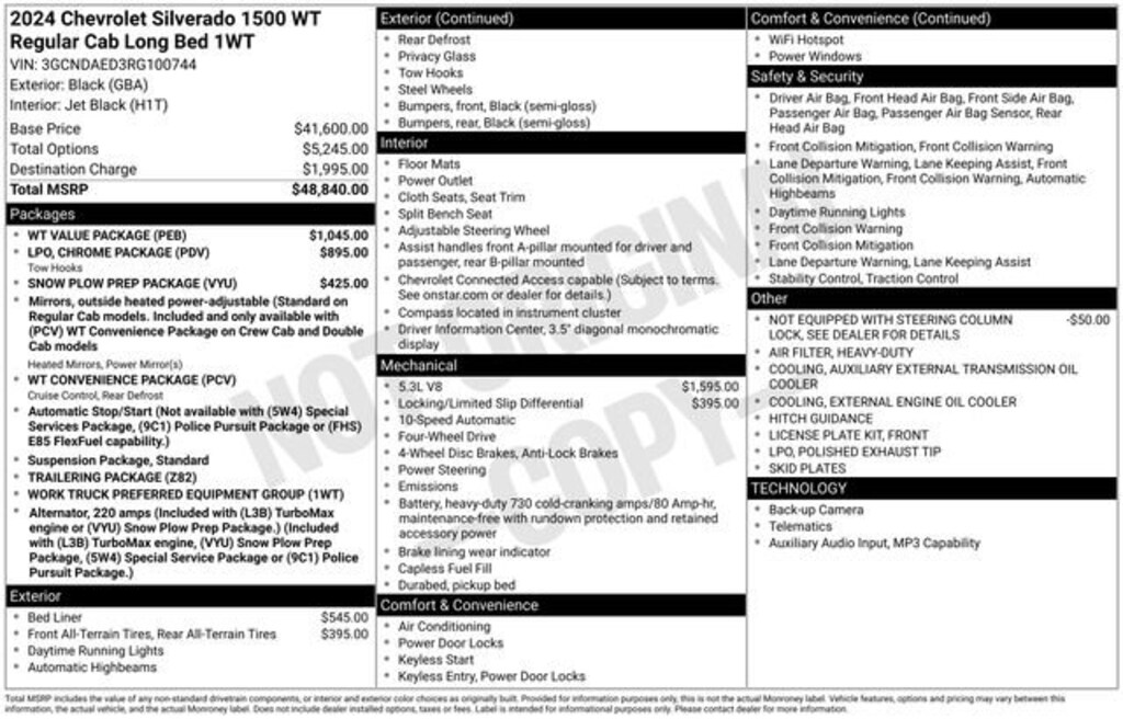 10-Speed Automatic, 4WD, Black Cloth, 220 Amp Alternator, 40/20/40 Front Split Bench Seat, 8.4 -Inch Display Audio w/ Electrostatic Touchscreen, Air Conditioning, Chevytec Spray-On Black Bedliner, Chrome Package, Chrome Recovery Hooks, Deep-Tinted Glass, Electric Rear-Window Defogger, Electronic Cruise Control, Heavy-Duty Air Filter, Hitch Guidance, Polished Exhaust Tip, Power door mirrors, Power Front Windows w/Driver Express Up/Down, Rear step bumper, Remote keyless entry, Snow Plow Prep Package, Trailering Package, Wheels: 17 x 8 Ultra Silver Painted Steel, WT Convenience Package, WT Value Package. Odometer is 19821 miles below market average! CARFAX One-Owner.Please call 1-860-536-4931 or visit us on the web at www.bobvalenti.com to confirm availability and location as we have multiple dealerships.Family owned and operated for over 95 years!